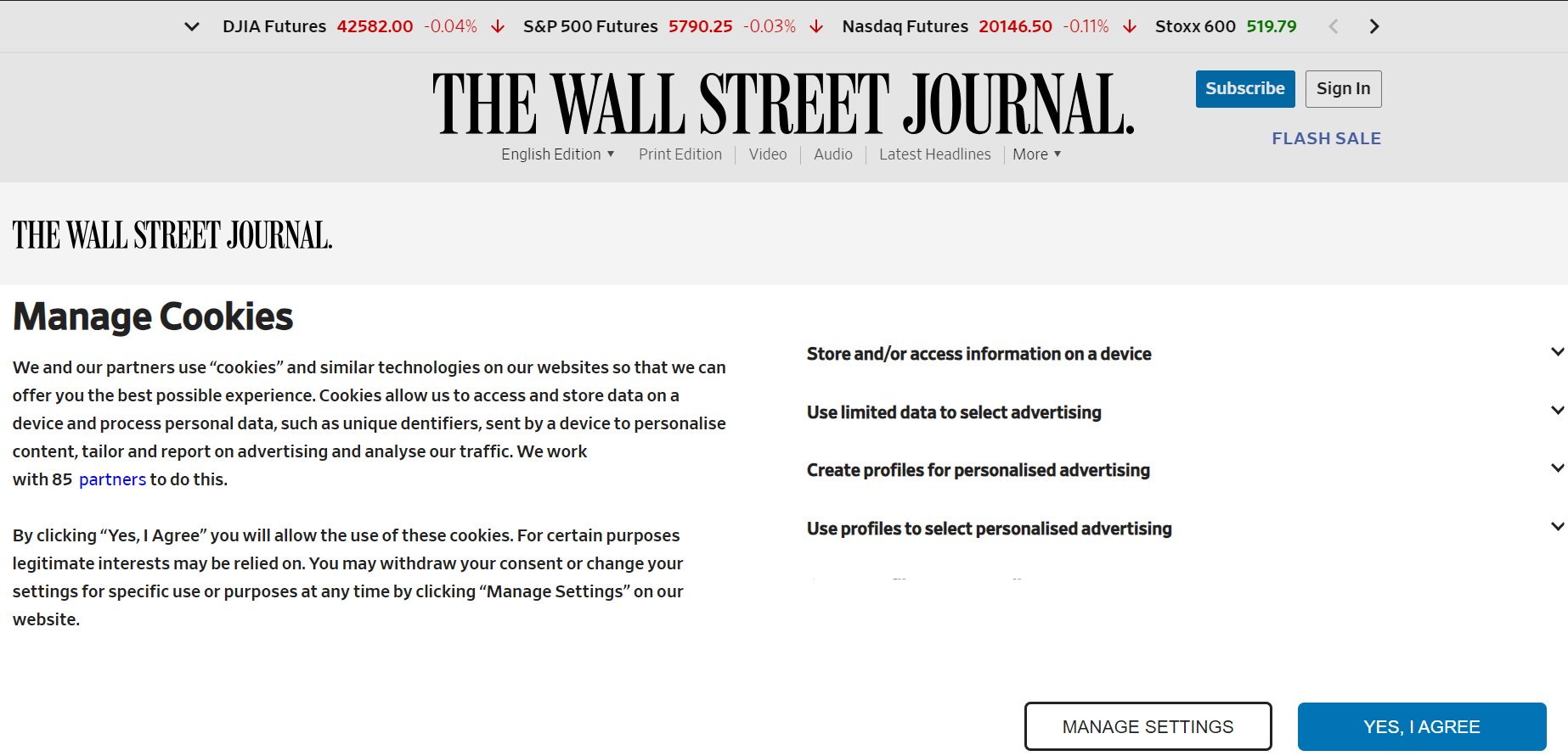 Take, for example, the Wall Street Journal. You're not allowed to read a single headline before you make a choice on cookies. And this is simply a single emblematic instance of cookie consent gone wild (for the record I read NONE of the consent language - take that, GDPR!) I was relieved to get back to the States and be able to read about the latest hellscape we've created for ourselves in the world without having to first accept cookies. America: land of the free, indeed.