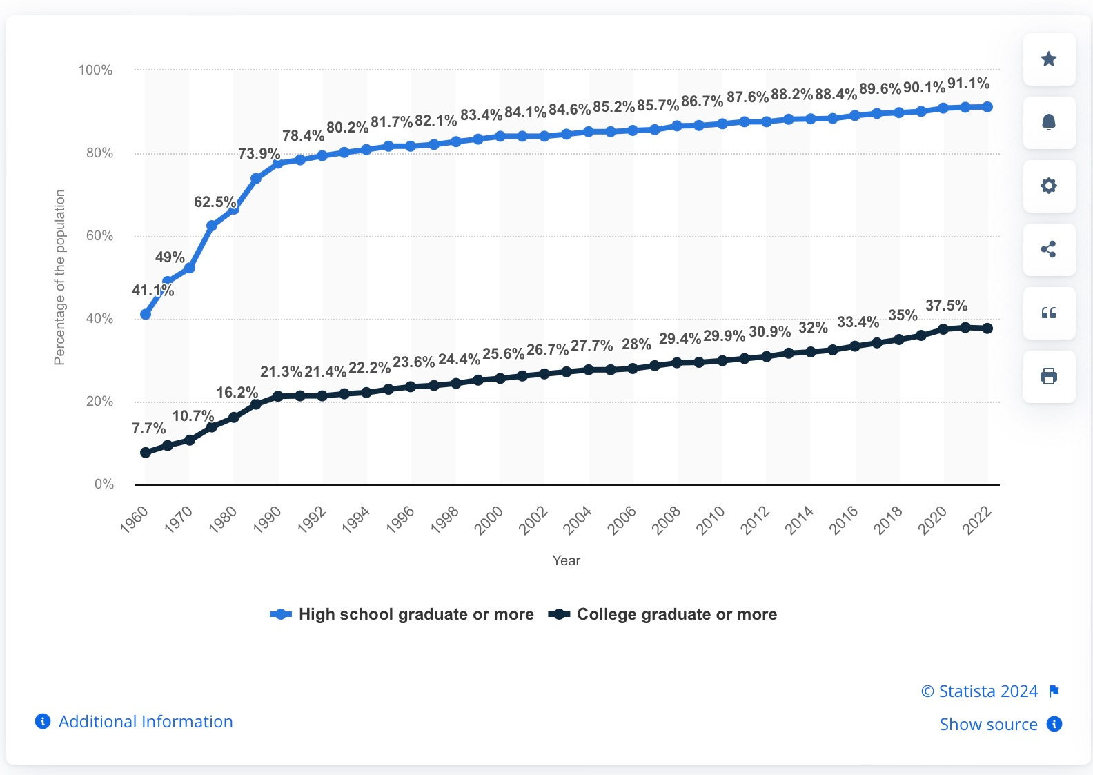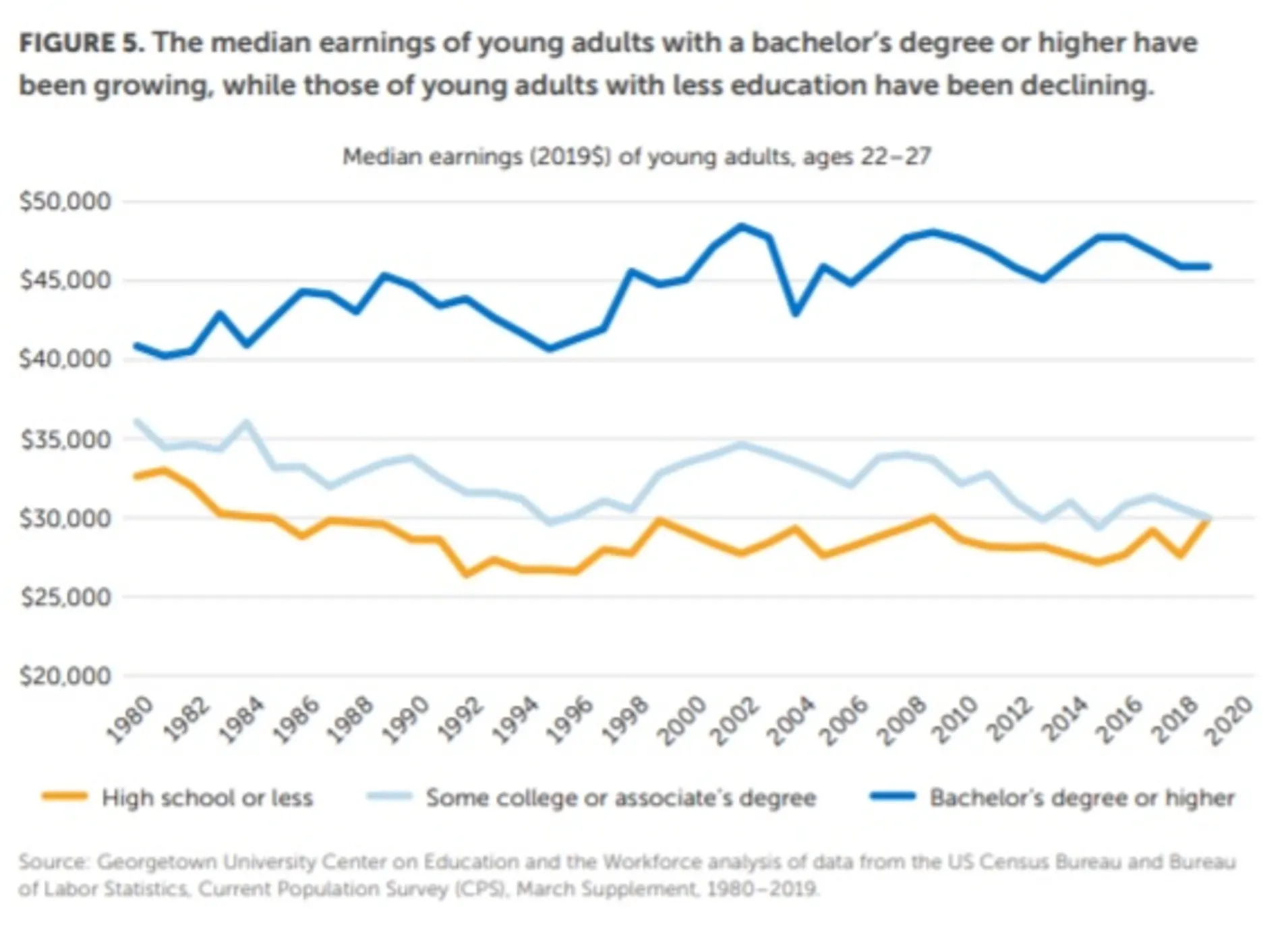 Part of the reason is that many jobs in America have typically required it. In 2021, 44% of US jobs required a 4-year degree. Given that less than 40% of Americans hold a 4-year degree, this suggests that there is actually a “degree gap” in the States and that 4-year degrees are still worth attaining.