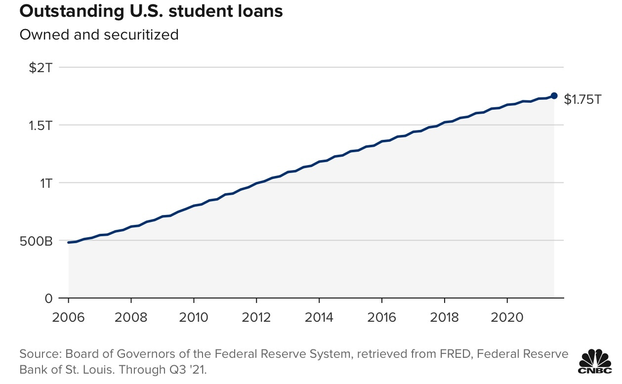 This has all led to an unprecedented debt crisis that sees the average debt load for grads at $30,000, up 3X from the 90s. In aggregate, there is over $1.7 trillion (with a T) of student debt in the US. Needless to say, this is not a sustainable model.