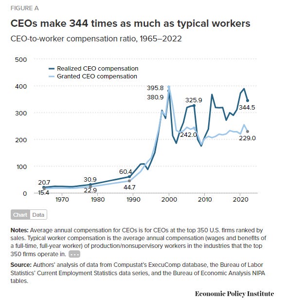 The reality in these companies is that the executives are paid an obscene amount when compared to the average employee. And this is a new trend: this kind of pay inequality is less than a generation old. CEO pay has increased over 1200% since 1978. The average employee? A paltry 15%.
