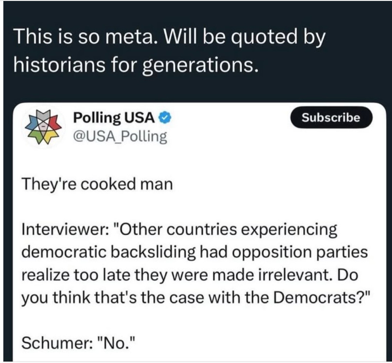 But Confucious was right when he said, “The man who moves a mountain begins by carrying away small stones.” The American empire is not one that can be undone in a single bound - we needed two Trump administrations with a feckless opposition party presidency in between to get to this path. That’s 12 years of descent via incremental damage - you can’t just pull the plane back up that quickly after something like that.